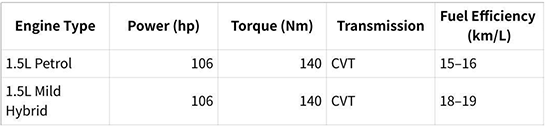 The Veloz is powered by a 1.5L petrol engine producing 106 hp and 140 Nm torque, paired with a CVT automatic transmission for smooth acceleration. Some trims may include mild hybrid technology to enhance fuel efficiency and reduce emissions.