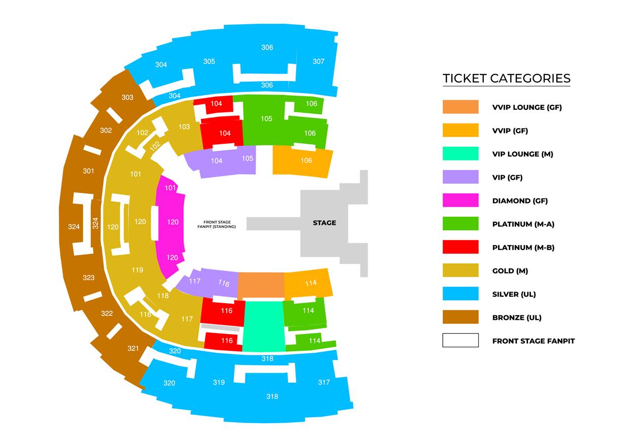 The Mezzanine (M) level includes the VIP Lounge (Purple), Gold (Yellow), Platinum A (Light Green), and Platinum B (Red) sections, offering an elevated view.