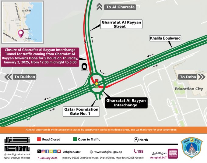 Starting tomorrow, January 2, 2025, the Gharrafat Al Rayyan Interchange Tunnel will be closed to traffic heading from Gharrafat Al Rayyan towards Doha.