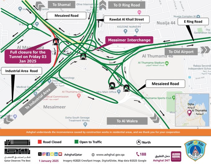 On Friday, January 3, 2025, the Mesaimeer Interchange Tunnel will be temporarily closed to traffic heading from Mesaieed Road towards the Industrial Area Road.